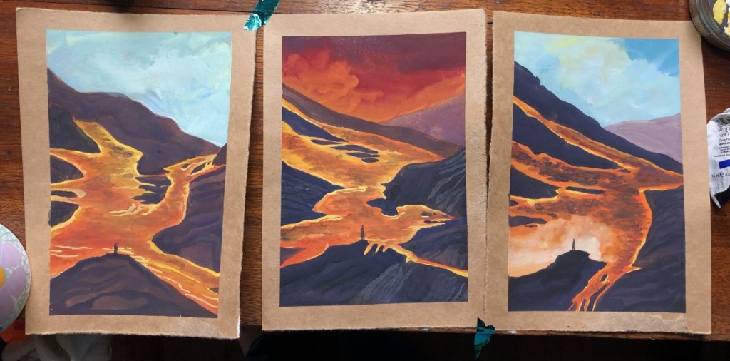 At the same time, I was working with Tallulah Cunningham, who designed the book cover. Tallulah (http://www.melanippos.com/) is an Australian natural history illustrator, a fantasy artist, and an illuminator. She read the manuscript when corrections were still in process, and rather dryly observed that she had noticed a few typos. (Yeah, no kidding.) Tallulah started drawing and painting volcano pictures on her live feed on Twitch, and I was able to watch her painting the drafts while narrating her creative process. I had originally requested a picture of a volcano that was also a dragon; we discussed a picture of a human person wearing a dragon mask; and settled on a small human figure silhouetted by lava flowing in the shape of a dragon. Here are some of Tallulah’s drafts: