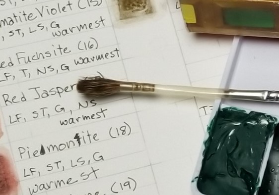 Yellow is a primary color, yet I haven’t found any mineral watercolors that are yellow—the nearest is yellow ochre, which is a brownish gold. So when I paint with these mineral watercolors, I’ll have to manage without yellow, or else use the yellow from my other paintbox. (My painter character can make yellow paint using turmeric, if she can get her hands on some). So far, I’ve only used these mineral paints to make a color chart. Next I need to investigate how the colors behave when mixed with each other. Then I think I’ll pretend to be the painter character and paint one of her paintings, using the natural pigments and the quill brush. I’ll post it here when it’s finished, so watch this space!