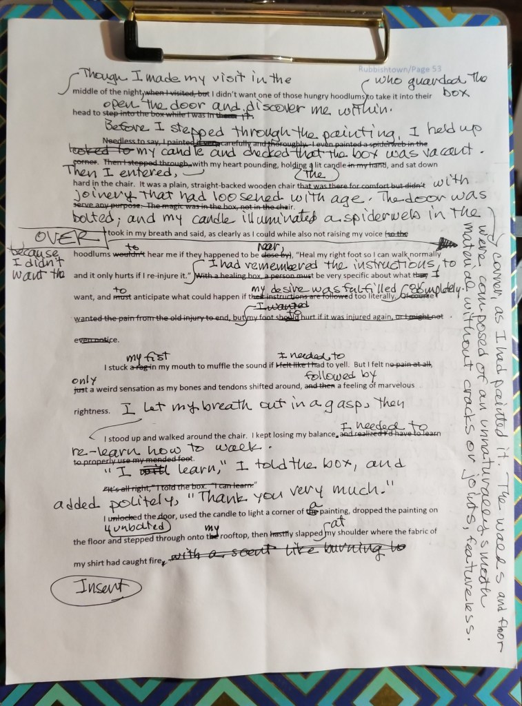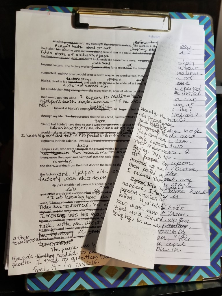 When I type up a chapter, comprehension becomes possible. The light-scatter coalesces into a focused beam, and I can see my book’s multitude of flaws and failures. And that’s okay: Imperfections are rocks that form a path across a river. I step on them, thank them, and leave them behind.